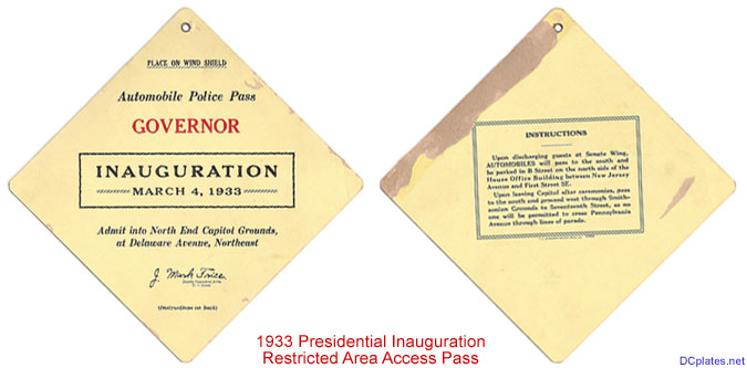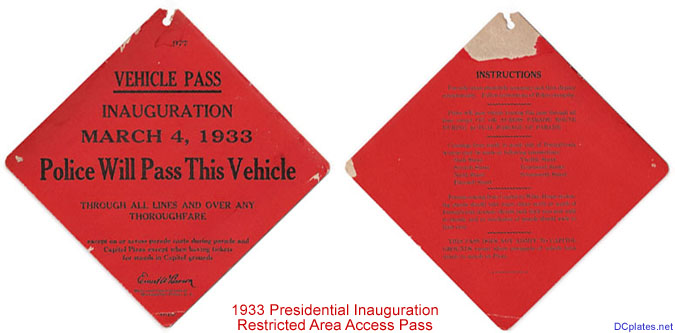 What is believed to be the first U.S. special event plate of any type is the first presidential inaugural plate, issued in the District of Columbia for the first inauguration of Pres. Franklin D. Roosevelt. On February 13, 1933, less than three weeks before inauguration day, the Board of Commissioners ordered "that the General Superintendent of Penal Institutions is hereby ordered to furnish the Inaugural Committee, 500 pairs of a special inaugural tag, with colors red, white and blue, and serially numbered." Based upon the relatively small number of plates made, it is likely that they were issued only for use in the inaugural parade and in conjunction with other official functions and were not available to the general public. A total of 68 of these plates were known to exist as of Sept. 2016, making them the most rare of all inaugural plates.