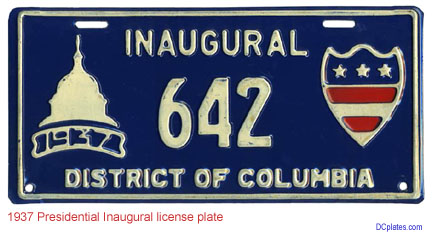 Fewer than 1,000 pairs of 1937 inaugural plates were produced, and as of Sept. 2016, 104 were known to exist. The year designation is somewhat difficult to read below the U.S. Capitol dome motif, and the red bars on the D.C. shield were spray painted. Not having bolt slots at the bottom resulted in extra holes being made in many 1937 inaugural plates, which were valid for use from January 12-27, 1937.