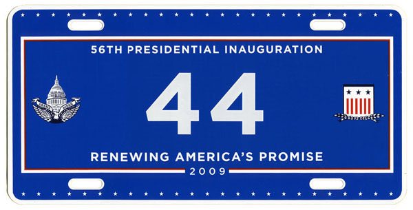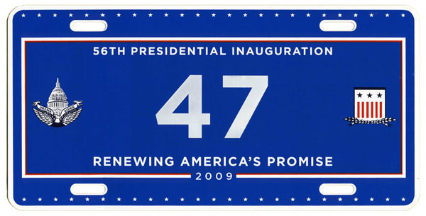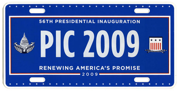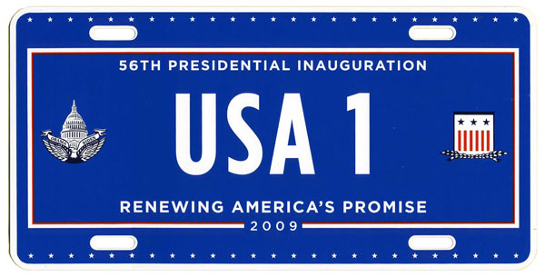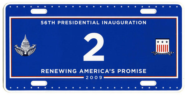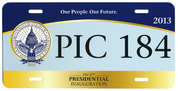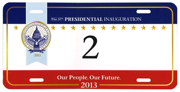 For the third consecutive inauguration a commemorative license plate with digitally-printed registration number characters and a fully graphic background was offered through a joint venture of Hunter International Corp. and Motor Vehicle License Systems. Although they could not be used on privately-owned vehicles, an expiration date legend, “Expires March 31, 2013,” is printed in small lettering in the lower right corner.