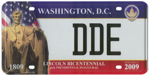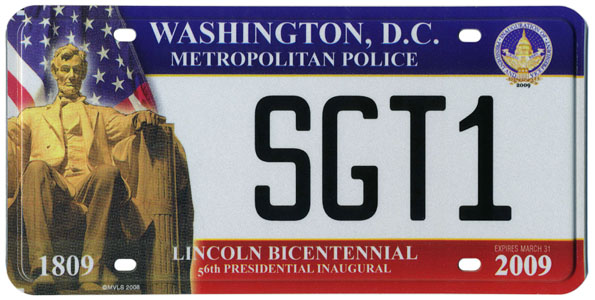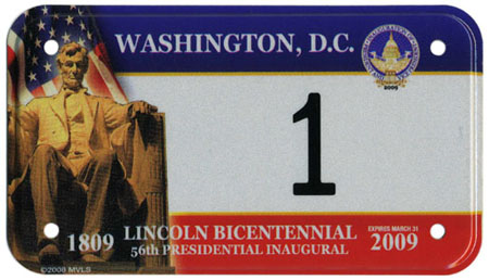 The second 2009 design was created and marketed by Hunter International Co. and produced by Motor Vehicle License Systems (MVLS), continuing their 2005 partnership. It prominently features an image of the Lincoln Memorial statue of Pres. Abraham Lincoln, commemorating the 200th anniversary of the birth of the Great Emancipator. These plates are flat with a debossed edge, and examples were widely marketed prior to inauguration day. Also like 2005, the Hunter/MVLS plate could not legally be used on motor vehicles, but rather was offered only as a souvenir. The flat plates were manufactured and sold in pairs, and all sold to the general public (i.e. all except those specially made for use during the inauguration) are personalized with up to five characters, printed in black. Their cost was $50 per set.
