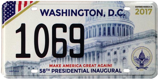 Most of the information and images on this page were provided by Charlie Gauthier, an expert on the subject of Presidential Inaugural license plate history. Mr. Gauthier has published a number of articles on the subject and has, over a period of decades, carefully built and maintained the most complete collection of inaugural plates and ephemera. As a District of Columbia native who now resides in Northern Virginia, he has worked directly with a number of past inaugural committees on their commemorative license plate programs. DCplates.com is sincerely grateful for his willingness to share his collection and knowledge through this page. For more information about these plates or to provide more information about or images of them, please send an e-mail to Mr. Gauthier at Charlie@DCplates.com.
