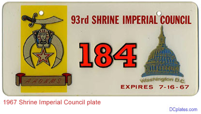 Although a number of Shrine Conventions and Conferences have been held in Washington, D.C. over the years, special event plates are known to have been issued only for five of them: 1935, 1958, 1961, 1965, and 1967. These plates were valid only for the few days of the actual convention or conference. In most cases the number of plates made and used is unknown, although numbers on plates held by collectors today suggest that no more than a few hundred of each were produced.